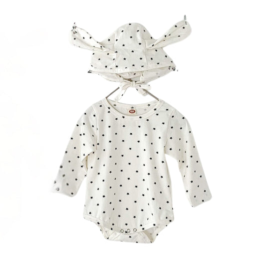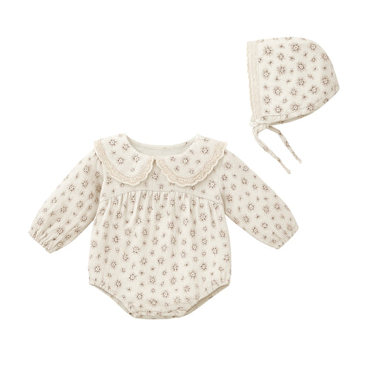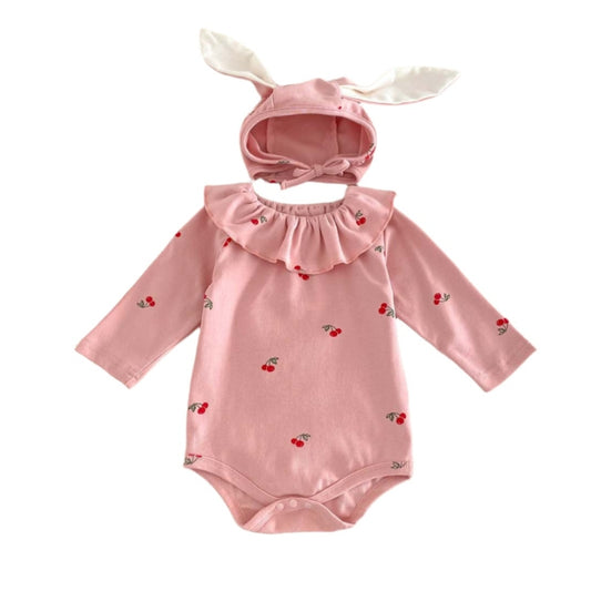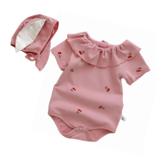 Cherry Print Ruffle Neck Romper and Bonnet Set