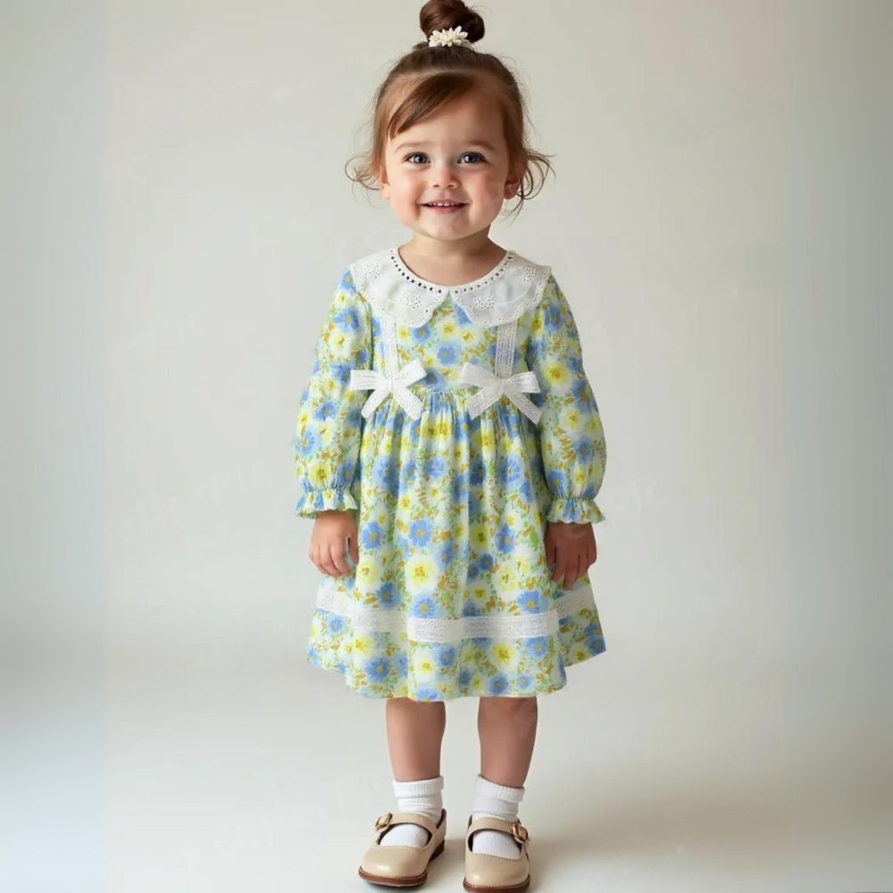 The classic floral print is complemented by delicate ruffle detailing and sweet bow accents, adding an extra touch of femininity. Available in blue, green, pink, and yellow, this versatile dress is ideal for family gatherings, casual outings, or special events.